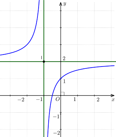 Do đó, đồ thị của hàm số có tiệm cận đứng là đường thẳng x = - 1, tiệm cận ngang là đường thẳng y = 2.