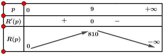 R'(x) = - 20p = 180; R'(x) = 0 ⇔ p = 9