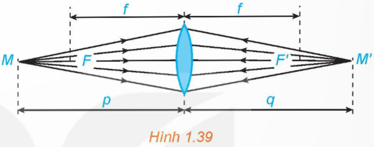 Bài 1.44 trang 44 toán 12 tập 1: Xét một thấu kính hội tụ có tiêu cự f (H.1.39). Khoảng cách p từ vật đến thấu kính liên hệ với khoảng cách q từ ảnh đến thấu kính bởi hệ thức: ![]()