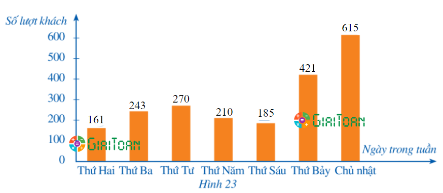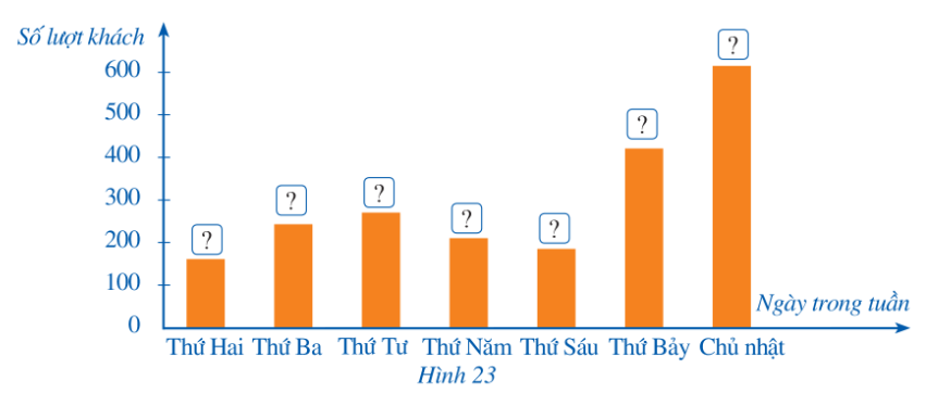 b) Hãy hoàn thiện biểu đồ ở Hình 23 để nhận được biểu đồ cột biểu diễn các dữ liệu thống kê số lượt khách đến cửa hàng trong những ngày đó. ![]() |