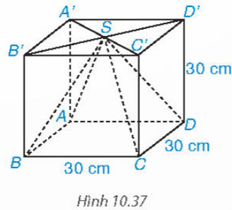 Bài 10.22 (sgk trang 124): Từ một khúc gỗ hình lập phương cạnh 30 cm (H.10.37), người ta cắt đi một phần gỗ để được phần còn lại là một hình chóp tứ giác đều có đáy là hình vuông cạnh 30 cm và chiều cao của hình chóp cũng bằng 30 cm. Tính thể tích của phần gỗ bị cắt đi.