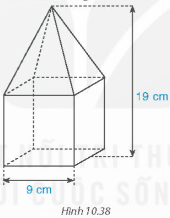 Bài 10.23 (sgk trang 124): Một khối gỗ gồm đế là hình lập phương cạnh 9 cm và phần trên là một hình chóp tứ giác đều (H.10.38). Tính thể tích khối gỗ.