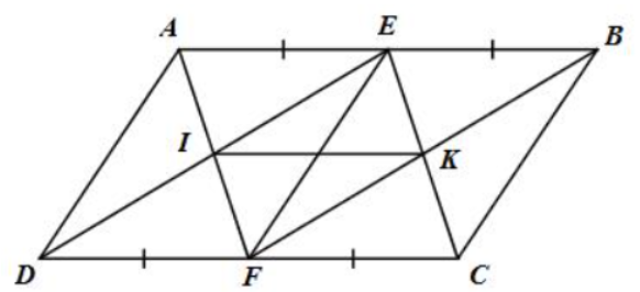 Bài 11 (sgk trang 89): Cho hình bình hành ABCD có AB = 2AD. Gọi E, F lần lượt là trung điểm của AB và CD. Gọi I là giao điểm của AF và DE, K là giao điểm của BF và CE. Chứng minh rằng: a) Tứ giác AECF là hình bình hành. b) Tứ giác AEFD là hình gì? Vì sao? c) Chứng minh tứ giác EIFK là hình chữ nhật. d) Tìm điều kiện của hình bình hành ABCD để tứ giác EIFK là hình vuông. |