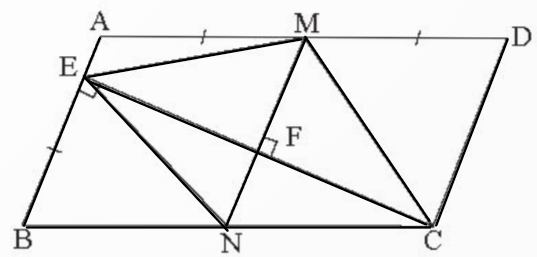 Bài 12 (sgk trang 89): Cho hình bình hành ABCD với AD = 2AB. Từ C vẽ CE vuông góc với AB. Nối E với trung điểm M của AD. Từ M vẽ MF vuông góc với CE, MF cắt BC tại N. a) Tứ giác MNCD là hình gì? b) Chứng minh tam giác EMC cân tại M c) Chứng minh: |