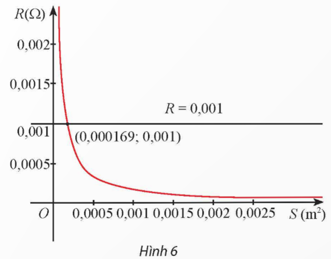b) Toạ độ giao điểm của đồ thị hàm số với đường thẳng R = 0,001 là (0,000169; 0,01), nghĩa là khi S = 0,000169 m2 thì R = 0,001 Ω.