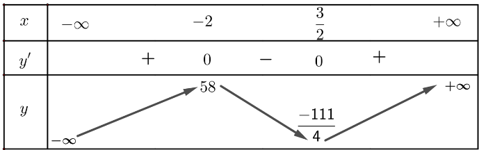 Hàm số đạt cực đại tại x = - 2, giá trị cực đại là f(- 2) = 58; hàm số đạt cực tiểu tại