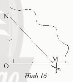 Bài 5 (sgk trang 87): Lấy một tờ giấy gấp làm tư để có một góc vuông như trong Hình 16, dùng kéo cắt theo đường MN sao cho OM = ON. Mở phần giấy cắt được ra ta được một tứ giác. Tứ giác đó là hình gì? Giải thích kết luận của em.