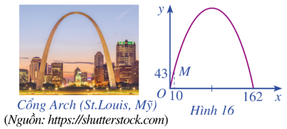 Khi du lịch đến thành phố St. Louis (Mỹ), ta sẽ thấy một cái cổng lớn có hình parabol hướng bề lõm xuống dưới, đó là cổng Arch. Giả sử ta lập một hệ toạ độ Oxy sao cho một chân cổng đi qua gốc O như Hình 16 (x và y tính bằng mét), chân kia của cổng ở vị trí có toạ độ (162;0). Biết một điểm M trên cổng có toạ độ là (10;43). Tính chiều cao của cổng (tính từ điểm cao nhất trên cổng xuống mặt đất), làm tròn kết quả đến hàng đơn vị.