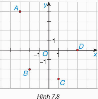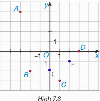 Bài 7.20 (sgk trang 45): a) Xác định tọa độ của các điểm A, B, C, D trong Hình 7.8 b) Xác định các điểm E (0; - 2) và F (2; - 1) trong Hình 7.8.