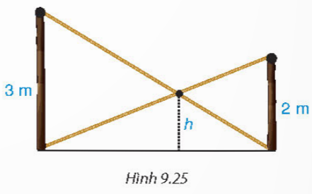 Bài 9.10 (sgk trang 90): Có hai chiếc cột dựng thẳng đứng trên mặt đất với chiều cao lần lượt là 3m và 2m. Người ta nối hai sợi dây từ đỉnh cột này đến chân cột kia và hai sợi dây cắt nhau tại một điểm (H.9.25), hãy tính độ cao h của điểm đó so với mặt đất.