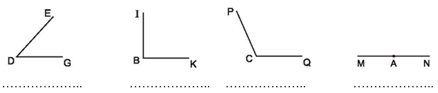 Bài 1: Viết các từ “góc bẹt”, “góc nhọn”, “góc tù”, “góc vuông” vào chỗ chấm dưới hình cho thích hợp: