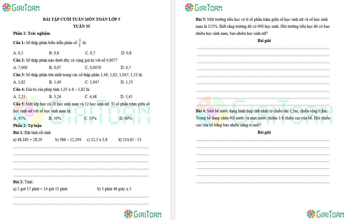 Bài tập cuối tuần Toán lớp 5 - Học kì 2 (Tuần 19 - 35) Từ Tuần 19 - Tuần 35