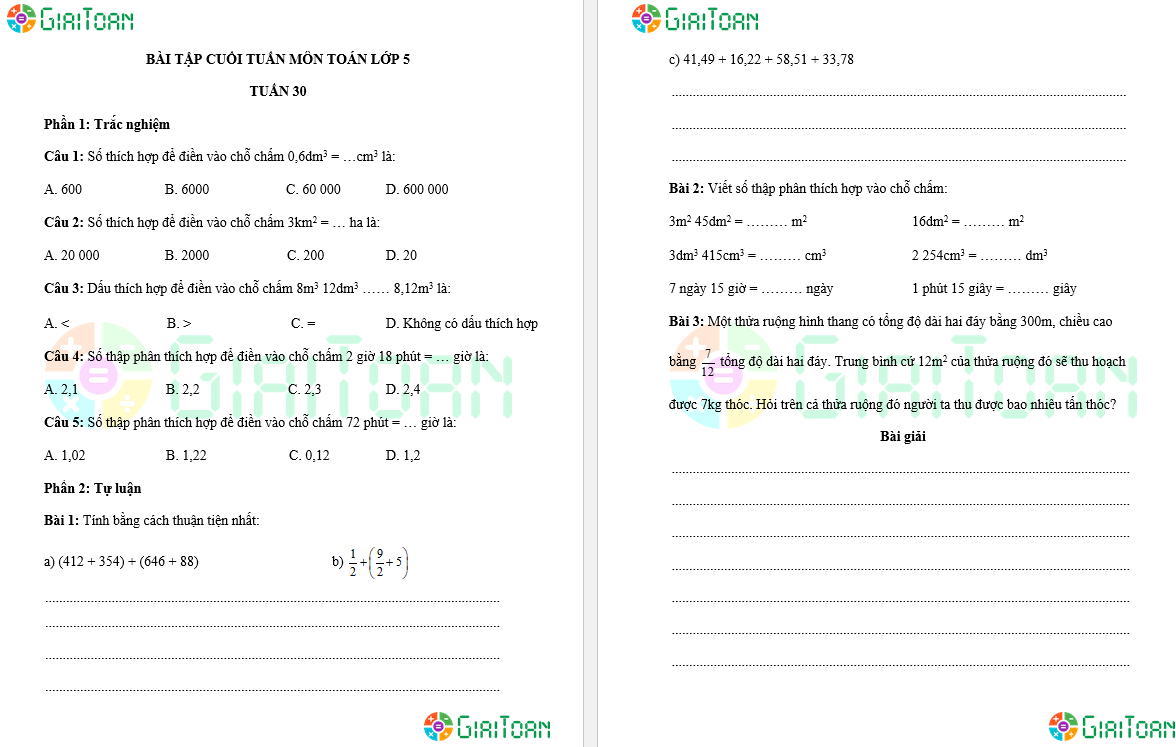 Bài tập cuối tuần Toán lớp 5 - Học kì 2 do GiaiToan biên soạn, tổng hợp lại kiến thức đã học ở học kì 2 chương trình Toán lớp 5, đủ 17 tuần của Học kì 2 cho các thầy cô tham khảo, là tài liệu ôn tập, ôn luyện bổ ích cho các em học sinh lớp 4.