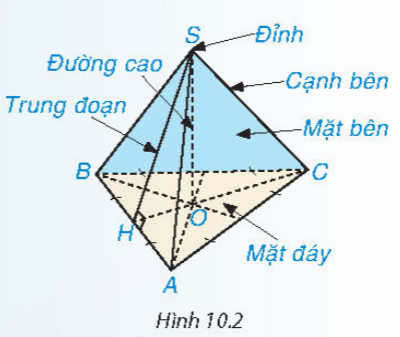 Câu hỏi (sgk trang 113): Hãy gọi tên đỉnh, cạnh bên, mặt bên, mặt đáy, đường cao, một trung đoạn của hình chóp tam giác đều S. ABC trong Hình 10.2.