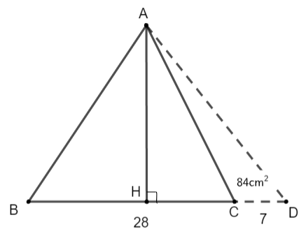 Đề bài: Cho hình tam giác ABC có đáy BC = 28 m. Nếu kéo dài đáy BC về phía C thêm một đoạn CD = 7 m thì diện tích tăng thêm 84 m2. Tính diện tích hình tam giác ABC. |