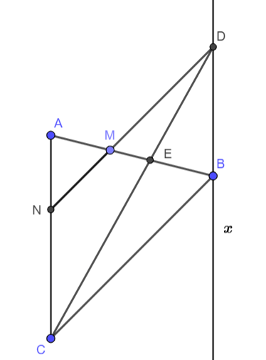 b) Qua B kẻ tia Bx song song với AC cắt MN tại D, gọi E là giao điểm của AB và CD. Chứng minh tam giác MED đồng dạng với tam giác BEC.