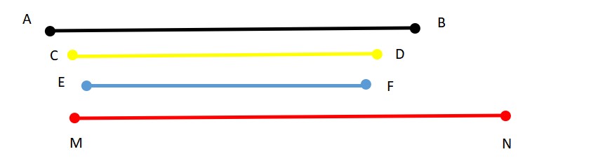 | A. Độ dài đoạn thẳng AB lớn hơn độ dài đoạn thẳng MN | B. Độ dài đoạn thẳng CD bằng độ dài đoạn thẳng EF |