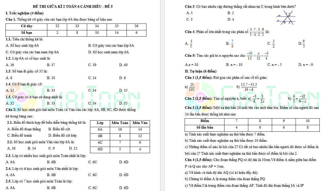 >> Tham khảo thêm: Đề thi giữa kì 2 Toán 6 Cánh Diều - Đề số 6