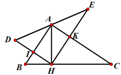 Câu 4: Cho tam giác ABC vuông tại A và đường cao AH. Gọi D là điểm đối xứng với H qua AC. Gọi I là giao điểm của AB và DH, K là giao điểm của AC và HE