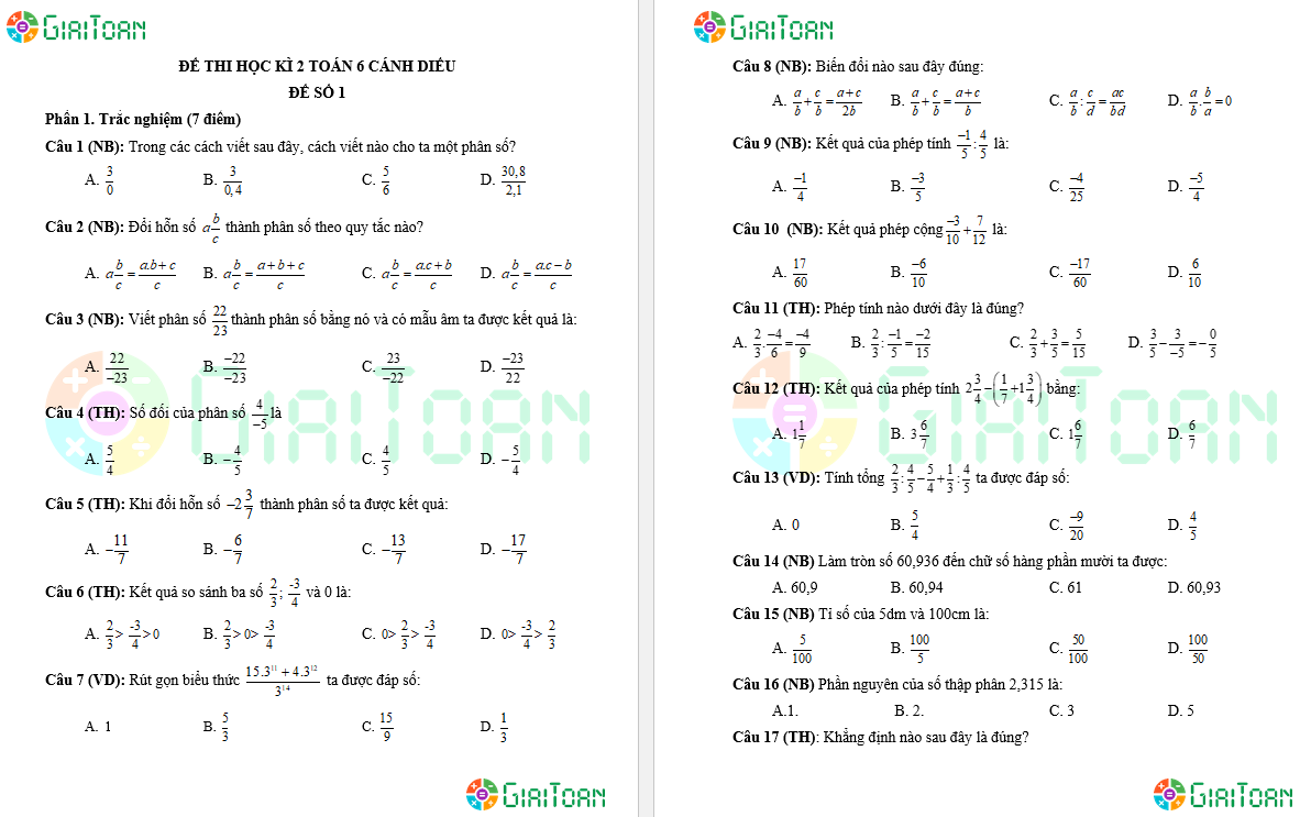 Đề thi học kì 2 Toán 6 Cánh Diều - Đề số 1 DownloadCác phiên bản khác và liên quan: