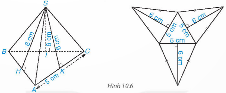 Hoạt động 1 (sgk trang 114): Quan sát hình chóp tam giác đều và hình khai triển của nó (H.10.6). Hãy tính tổng diện tích các mặt bên của hình chóp.