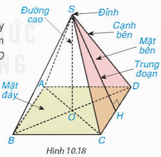 Hoạt động 1 (sgk trang 117): Gọi tên đỉnh, các cạnh bên của hình chóp. Hình chóp S. ABCD trong Hình 10.18 có mặt đáy ABCD là hình vuông, các mặt bên là những tam giác cân bằng nhau, có chung đỉnh. Ta gọi S.ABCD là hình chóp tứ giác đều.