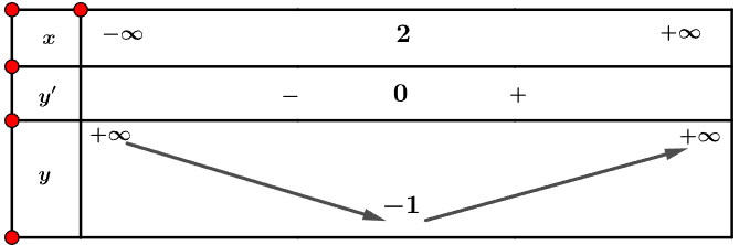 Do đó, hàm số đạt cực tiểu tại x = 2 và yCT = y(2) = - 1. Hàm số không có cực đại.
