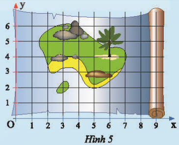 Hoạt động 2 (sgk trang 11): Bạn Khoa tìm được tấm bản đồ cổ cho biết kho báu của thuyền trưởng Độc Nhãn trên đảo Hòn Dừa (Hình 5) được dấu tại điểm có tọa độ (6; 4). Em hãy kẻ một đường thẳng vuông góc với Ox tại điểm 6 và một đường thẳng vuông góc với Oy tại điểm 4. Xác định giao điểm của hai đường thẳng vừa vẽ để giúp bạn Khoa tìm kho báu.