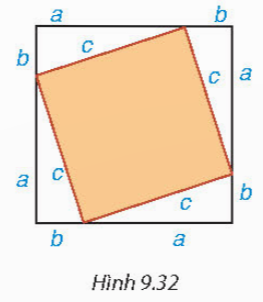 Hoạt động 2 (sgk trang 93): Lấy giấy trắng cắt bốn tam giác vuông bằng nhau. Gọi a, b là độ dài hai cạnh góc vuông, c là độ dài cạnh huyền của các tam giác vuông này. Cắt một hình vuông bằng tấm bìa có cạnh dài a + b. Dán bốn tam giác vuông lên tấm bìa như Hình 9.32.