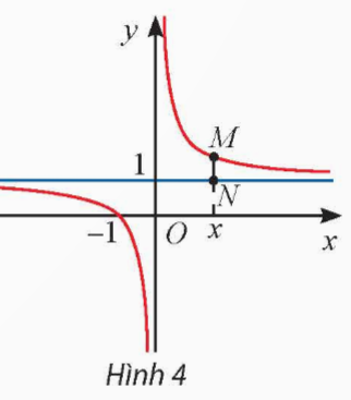 b) Đường thẳng vuông góc với trục Ox tại điểm x cắt đồ thị hàm số tại điểm M và cắt đường thẳng y = 1 tại điểm N (Hình 4). Tính MN theo x và nhận xét về MN khi