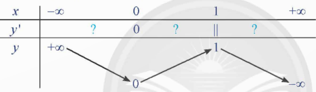 c) Thay mỗi dấu ? bằng kí hiệu (+, −) thích hợp để hoàn thành bảng biến thiên dưới đây. Nhận xét về dấu của y' khi x đi qua điểm cực đại, cực tiểu.