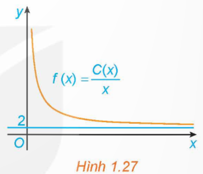 . Hãy giải thích tại sao chi phí trung bình giảm theo x nhưng luôn lớn hơn 2 triệu đồng/sản phẩm. Điều này thể hiện trên đồ thị của hàm số f(x) trong Hình 1.27 như thế nào?
