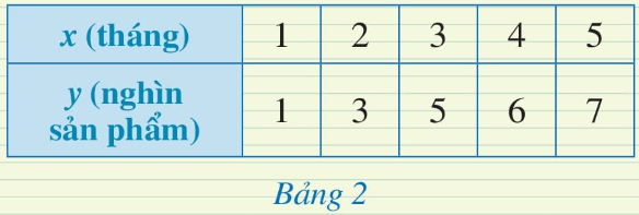 Luyện tập 2 (sgk trang 64): Số lượng sản phẩm bán được y (nghìn sản phẩm) là một hàm số theo thời gian x (tháng). Hàm số này được biểu thị dưới dạng Bảng 2.