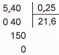 ![]() | • Phần thập phân của số 0,25 có hai chữ số. • Chuyển dấu phẩy của số 5,4 sang bên phải một chữ số và viết thêm một chữ số 0 vào bên phải được số 540; bỏ dấu phẩy ở số 0,25 được 25. • Thực hiện phép chia 540 : 25 Vậy 5,4 : 0,25 = 21,6 |