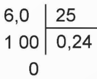 ![]() | Chuyển 6 thành 6,0. Đặt tính rồi chia như phép chia 6,0 : 25 (chia số thập phân cho số tự nhiên) Vậy 6 : 25 = 0,24 |