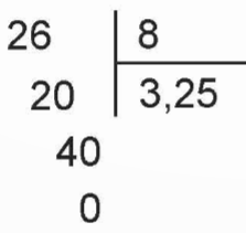 ![]() | • 26 chia 8 được 3, viết 3 3 nhân 8 bằng 24; 26 trừ 24 bằng 2, viết 2. • Để chia tiếp, ta viết thêm dấu phẩy vào bên phải 3 • Viết thêm chữ số 0 vào bên phải 2 được 20. 20 chia 8 được 2, viết 2. 2 nhân 8 bằng 16; 20 trừ 16 bằng 4, viết 4. • Viết thêm chữ số 0 vào bên phải 4 được 40. 40 chia 8 được 5, viết 5. 5 nhân 8 bằng 40; 40 trừ 40 bằng 0, viết 0. Vậy 26 : 8 = 3,25 |