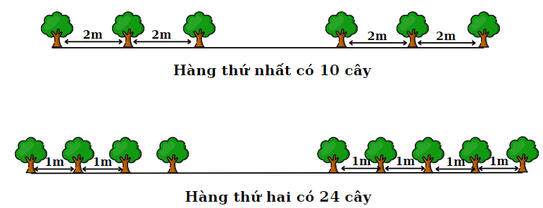 Đề bài: Một hàng cây gồm 10 cây, cứ 2 cây liền nhau thì cách nhau 2m. Một hàng cây khác gồm 24 cây, cứ 2 cây liền nhau cách nhau 1m. Hàng cây thứ nhất có dài hơn hàng cây thứ hai không? Mỗi hàng cây dài bao nhiêu mét? |