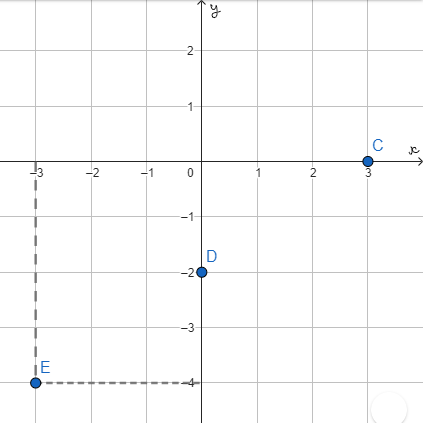 Các điểm C(3; 0), D(0; -2), E(- 3; - 4) được xác định trên mặt phẳng tọa độ Oxy như hình dưới đây: