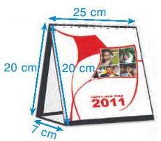 Ví dụ: Một quyển lịch để bàn (Hình bên dưới) gồm các tờ lịch được đặt trên một giá đỡ bằng bìa có dạng hình lăng trụ đứng tam giác. Tính diện tích bìa dùng để làm giá đỡ của quyển lịch.