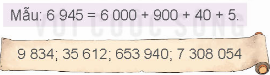 | 7 triệu, 9 trăm nghìn, 6 nghìn, 4 trăm và 5 chục | 7 906 450 | Bảy triệu chín trăm linh sáu nghìn bốn trăm năm mươi |