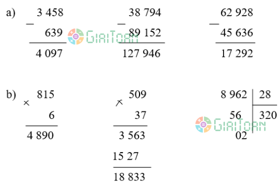 a) 3 458 + 639 38 794 + 89 152 62 928 – 45 636 | b) 815 × 6 509 × 37 8 962 : 28 |