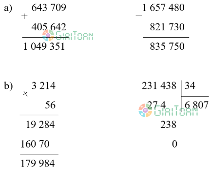 a) 643 709 + 405 642 1 657 480 – 821 730 | b) 3 214 × 56 231 438 : 34 |