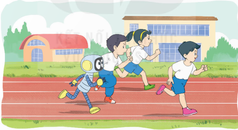 Các bạn Mai, Nam, Việt và Rô bốt chạy thi theo chiều dài sân trường. Mai chạy hết