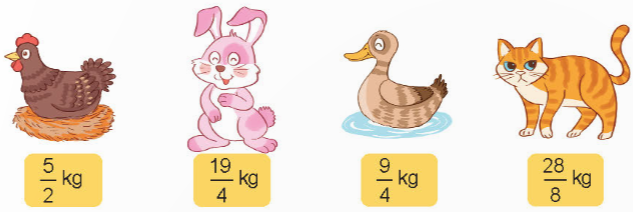 Viết tên các con vật dưới đây theo thứ tự có cân nặng từ bé đến lớn.