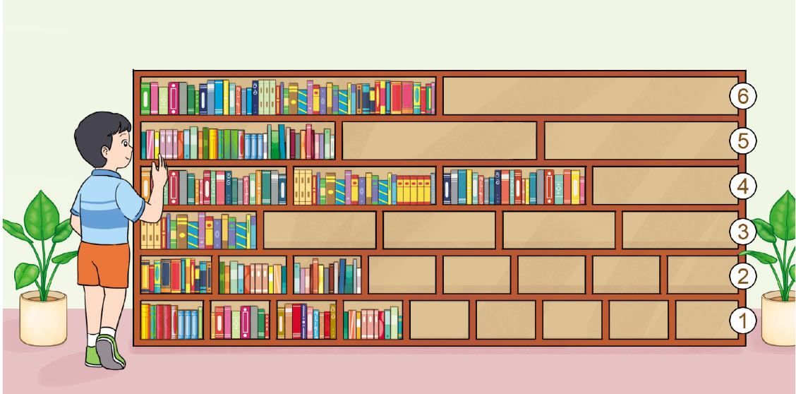 Nêu phân số chỉ số phần đã xếp đầy sách trong mỗi hàng của giá sách dưới đây: