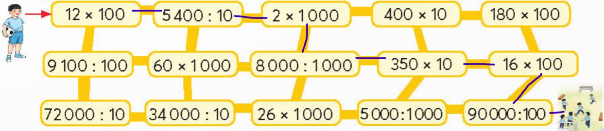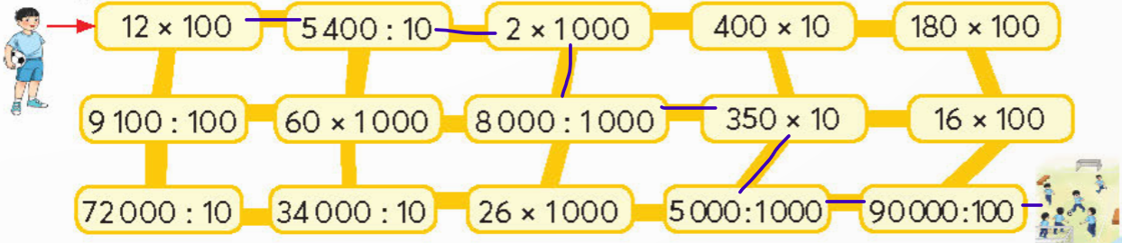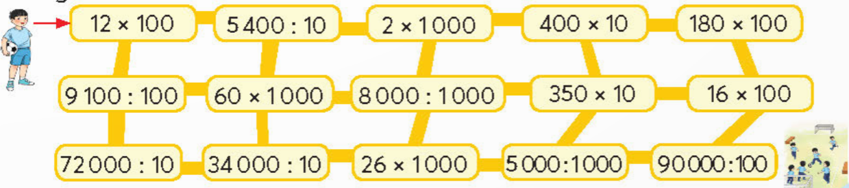 Giúp bạn đi theo các phép tính có kết quả bé hơn 4000 để đến sân bóng đá.