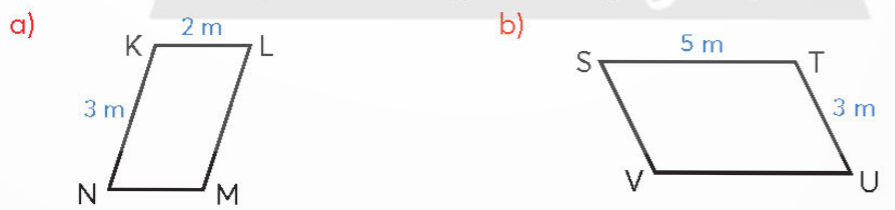 Nêu các cặp cạnh đối diện song song và bằng nhau của mỗi hình bình hành dưới đây. Nêu số đo độ dài các cạnh của hình bình hành.