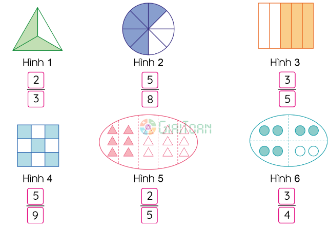 Phân số chỉ số phần đã tô màu có tử số là số phần tô màu, mẫu số là số phần bằng nhau của hình đó.