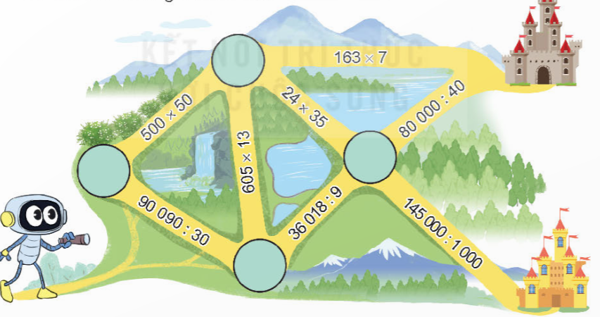Rô-bốt đến kho báu theo các đoạn đường ghi phép tính có kết quả là số lẻ. Hỏi kho báu ở trong tòa nhà nào?