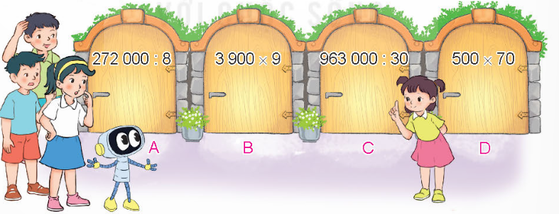 Mi đã đặt một món quà sau ô cửa ghi phép tính có kết quả lớn nhất. Mai, Việt, Nam và Rô-bốt theo thứ tự đi vào các ô cửa A, B, C, D. Hỏi bạn nào nhận được món quà của Mi?